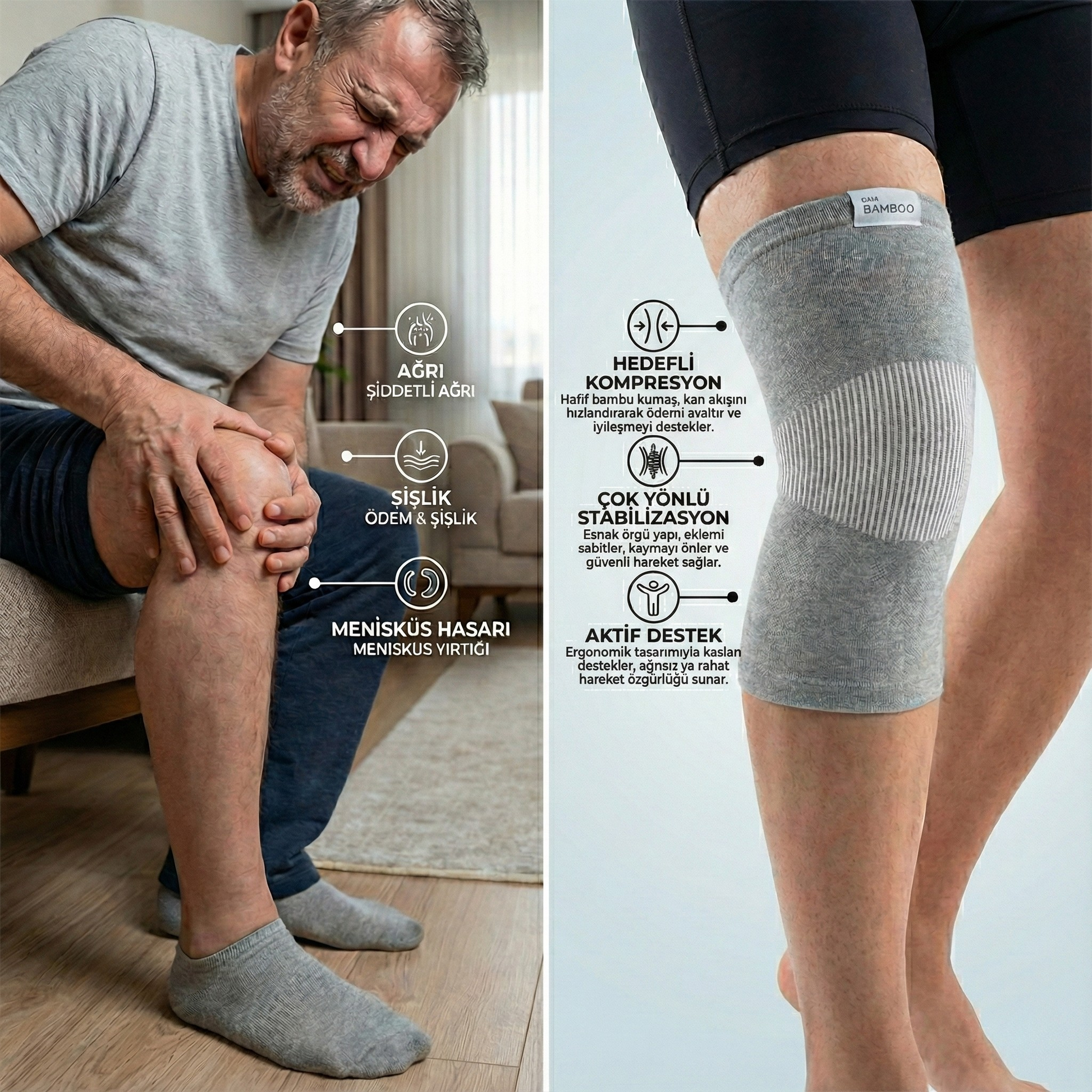 👉 Düzenli kullanımda, diz çevresindeki dolaşım desteklenir, ödem ve şişlik daha hızlı dağılır; uzun süre ayakta kalma, merdiven çıkma ve yürüyüşlerde konfor artar.